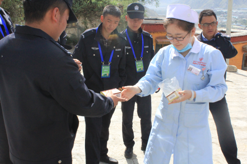 8月14日上午,阜康醫(yī)院組織起一支醫(yī)療小分隊,攜帶各種藥物與電子血壓計等醫(yī)療器械,在醫(yī)務(wù)科副主任黃川川及歐醫(yī)生等人的帶領(lǐng)下,奔赴哲蚌寺,步行走過寺廟各大角落,為駐守哲蚌寺各條線路的廣大執(zhí)勤民警送醫(yī)送藥,送去關(guān)懷。