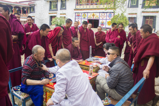 義診現(xiàn)場,醫(yī)療隊熱情接待每一位前來就診或咨詢的僧侶,為其看病、發(fā)放藥品及講解日常健康知識和自我保健的方法,僧侶們也由一開始的只是駐足觀望轉為積極上前就診,并主動向醫(yī)療隊闡述自己的病狀,同時針灸科李泉濤醫(yī)生更是不間斷地為多位經常久坐寺中的僧侶推拿與按摩頸、肩、腰、腿等各個部位。中午時分,醫(yī)療隊還受邀與僧侶們一起吃齋飯。