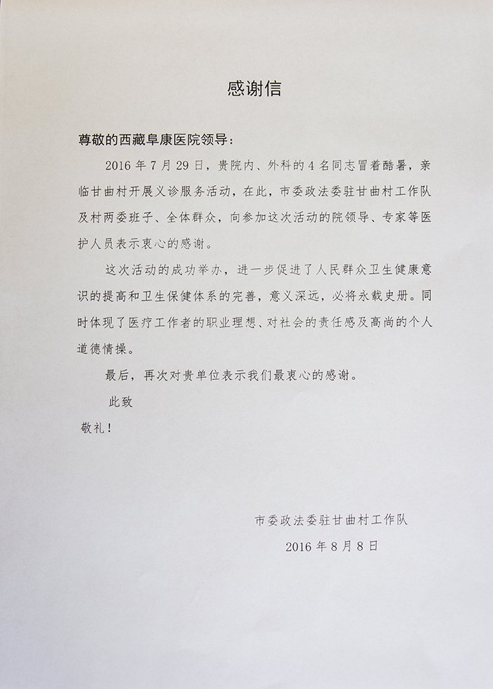 2016年7月,林周縣朱加村村委會(huì)、甘曲村村委會(huì)受當(dāng)?shù)卮迕袼?,與林周縣人民醫(yī)院和西藏阜康醫(yī)院相關(guān)負(fù)責(zé)人取得聯(lián)系,希望能夠派遣醫(yī)療義診隊(duì)為當(dāng)?shù)卮迕衩赓M(fèi)義診。7月29日經(jīng)相關(guān)領(lǐng)導(dǎo)協(xié)調(diào),西藏阜康醫(yī)院派出了由外科專家李玉仲、內(nèi)科專家劉占懷及幾名護(hù)理人員組成的義診小分隊(duì)先后前往朱加村、甘曲村為當(dāng)?shù)卮迕衩赓M(fèi)義診。