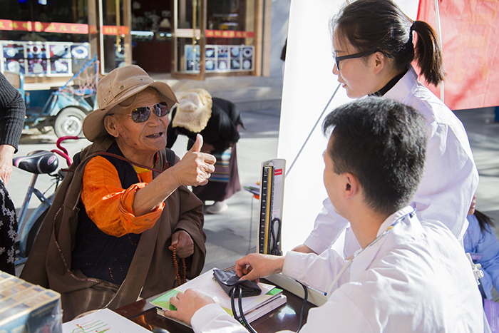 在活動(dòng)期間,前來(lái)阜康醫(yī)藥義診宣傳點(diǎn)的藏族同胞及社會(huì)群眾紛紛表達(dá)了自己對(duì)阜康醫(yī)藥全體員工的感謝,一位年齡較大的藏族老伯前來(lái)測(cè)量完血壓并咨詢了一些自己身體健康方面的問(wèn)題之后,更是再三對(duì)阜康醫(yī)藥的醫(yī)護(hù)人員表達(dá)了謝意,并且毫不吝嗇贊美之情地對(duì)我們豎起了大拇指!西藏自治區(qū)德吉副主席等幾位領(lǐng)導(dǎo)在本次活動(dòng)巡查工作中,于阜康醫(yī)藥免費(fèi)義診宣傳點(diǎn)與我院醫(yī)護(hù)人員等進(jìn)行了交流,并再次表達(dá)了對(duì)阜康醫(yī)藥長(zhǎng)期以來(lái)積極參與各項(xiàng)活動(dòng)、傾情奉獻(xiàn)社會(huì)民族、熱心回饋西藏百姓的誠(chéng)摯的感謝。