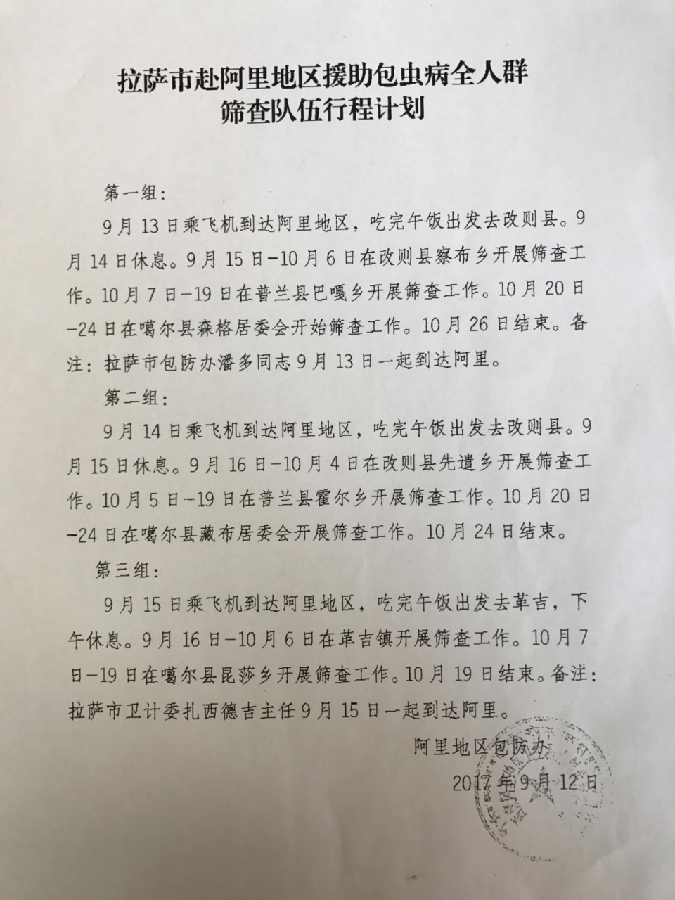 經(jīng)了解,此次包蟲篩查工作,拉薩市衛(wèi)計(jì)委邀請(qǐng)并組織3支共18人的醫(yī)療小分隊(duì)。我院是第三組,分在阿里的革吉鎮(zhèn)和噶爾縣昆莎鄉(xiāng)兩個(gè)篩查點(diǎn),共將篩查3564人。另外兩組分別是改則縣察布鄉(xiāng)(2650人)和先遣鄉(xiāng)(2050人)。從分配工作計(jì)劃上看我組分配的篩查人員最多,人員也比較分散,給工作增加了難度,小組預(yù)計(jì)將9月17日~10月19日完成篩查工作。