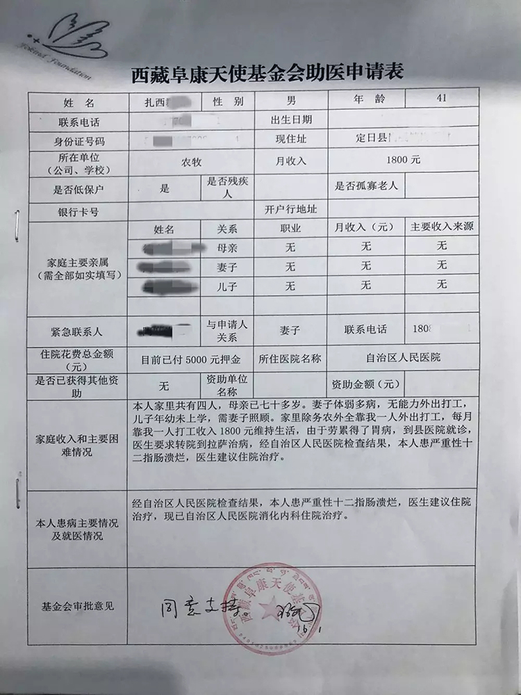 據(jù)了解,扎西因勞累患上胃病,在縣醫(yī)院的建議下轉(zhuǎn)至自治區(qū)人民醫(yī)院治療,經(jīng)自治區(qū)人民醫(yī)院檢查確診為:十二指腸潰瘍,建議入院治療。但扎西的家庭十分困難,妻子體弱多病,全家僅靠扎心每月打工收入1800元維持生活,無力支付醫(yī)療費用。在社會好心人士的介紹下,向阜康天使基金會提出了助醫(yī)申請。