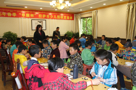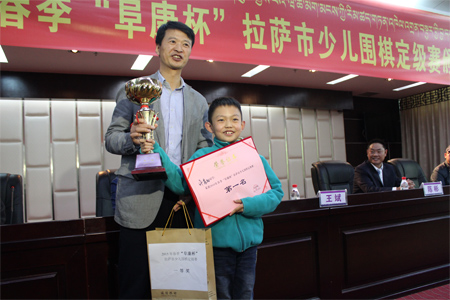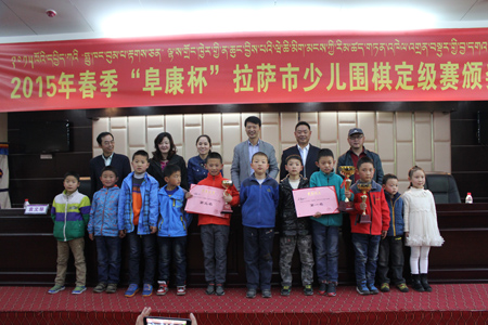 3月25日比賽結(jié)束后“復(fù)康杯”少兒圍棋定級賽頒獎儀式開始,拉薩棋院院長王斌、西藏阜康醫(yī)藥發(fā)展有限公司總經(jīng)理劉瀟瀟、西藏阜康醫(yī)藥發(fā)展有限公司總經(jīng)理陳彬、拉薩棋院圍棋部副主任趙鈞以及棋院老師陳學(xué)滸、袁文琴出席了本次會議。 王斌院長在頒獎儀式表示,很高興能夠舉辦拉薩市首屆“阜康杯”少兒圍棋定級賽,他向比賽獲勝者表示衷心的祝賀,希望他們能再接再厲繼續(xù)學(xué)習(xí)圍棋。他了解到很多家長對拉薩市棋院選址郵政賓館非常滿意,這里環(huán)境清幽,非常適合教學(xué),他當(dāng)場表示郵政賓館二樓已經(jīng)被棋院斥資180萬元租賃6年,至少在6年以內(nèi)棋院不會從新選址。王斌表示,目前,拉薩棋院正在向上級有關(guān)部門申請圍棋段位資格證的相關(guān)事宜,如無意外,預(yù)計在今年年底能夠申請成功,完成圍棋段位資格證的申請,不僅能給我區(qū)圍棋事業(yè)的發(fā)展帶來很大的幫助同時也能讓我區(qū)更多的圍棋愛好者參與到此次項目。