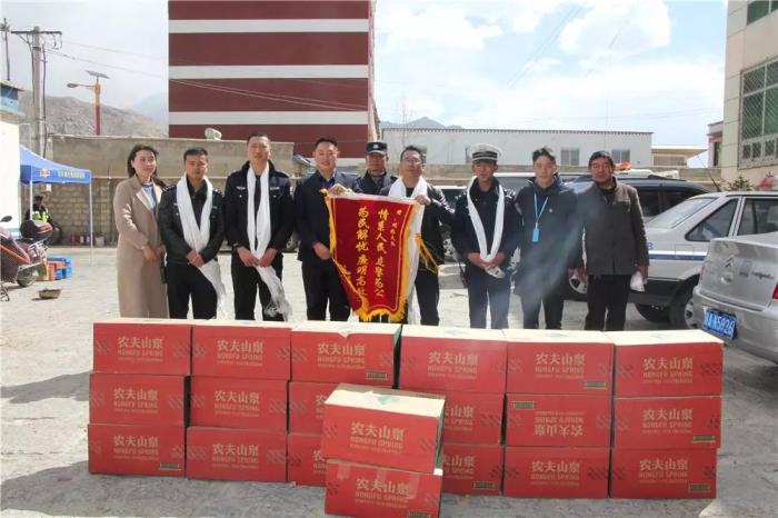 為拉薩市公安局交通警察支隊城北大隊送去錦旗和20箱礦泉水