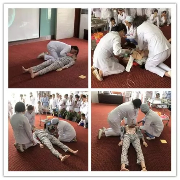 護理部主任王青青、兒科周玲護士長及產(chǎn)科二病區(qū)代理護士長李艷三人配合進行了心肺復蘇除顫操作技術。本次講課內容豐富并貼近實際工作,老師現(xiàn)場操作演示護理技術,護理人員積極互動,各科室分別派出三人進行了實操演練,在老師的指導下熟悉了流程并掌握了重點步驟。