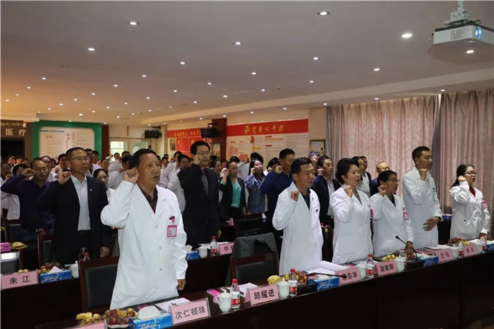 慶?;顒釉谙挛?5點準(zhǔn)時進(jìn)行。西藏阜康醫(yī)院醫(yī)務(wù)科主任田鵬帶領(lǐng)與會醫(yī)師代表宣讀“希波克拉底誓言”,西藏阜康醫(yī)院婦產(chǎn)兒童院區(qū)(院區(qū)三)劉連福院長致辭。