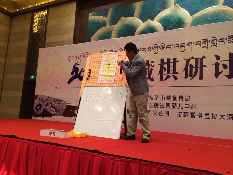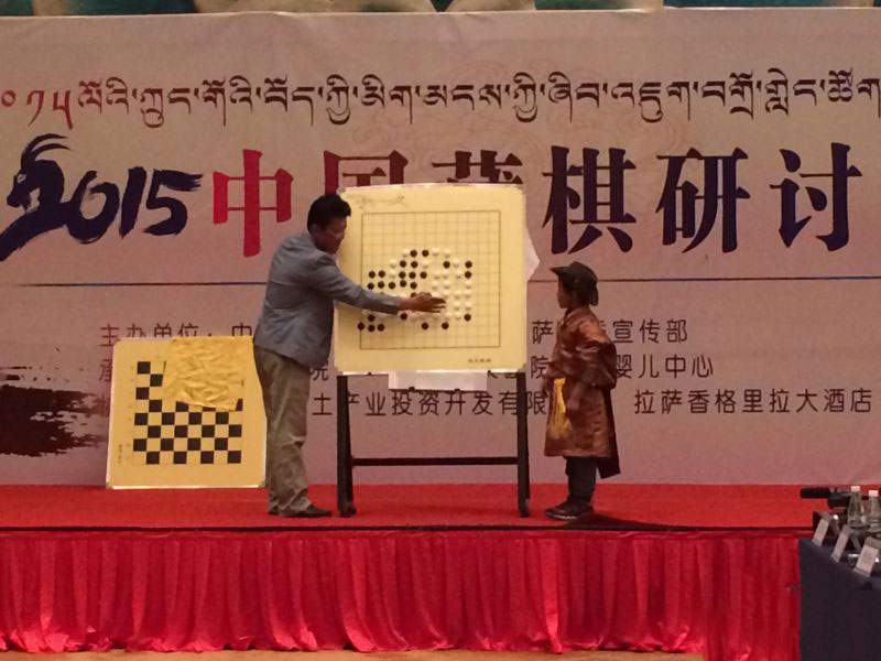 11月7日上午10時30分,2015中國藏棋研討會在香格里拉大酒店1號宴會廳開幕,阿旺邊巴老師現(xiàn)場講解藏棋歷史沿革、發(fā)展分布概況及藏式圍棋(密芒)、久、國王與大臣等藏棋介紹。并與現(xiàn)場人員互動演繹“國王與大臣棋”、“魚棋”等。