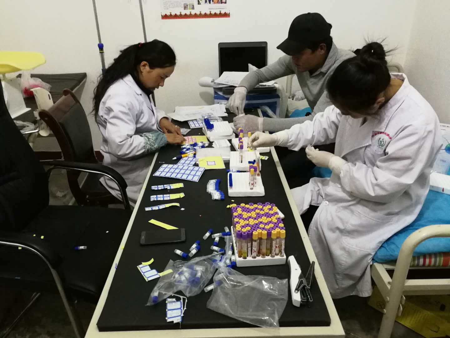 在篩查完夏瑪村牧業(yè)點后,醫(yī)療隊又迅速趕往鹽湖鄉(xiāng)。我們走進(jìn)鹽湖鄉(xiāng)衛(wèi)生院,隨處都能看到包蟲病防治知識張貼畫和宣傳欄。15、16日,在鹽湖鄉(xiāng)衛(wèi)生院篩查的工作量很大,每天篩查結(jié)束后,還要對當(dāng)天的血液進(jìn)行分離,醫(yī)療隊的隊員們一天工作下來已經(jīng)累得說不出話來,每天經(jīng)常是一早出門,工作到凌晨才回到住所。