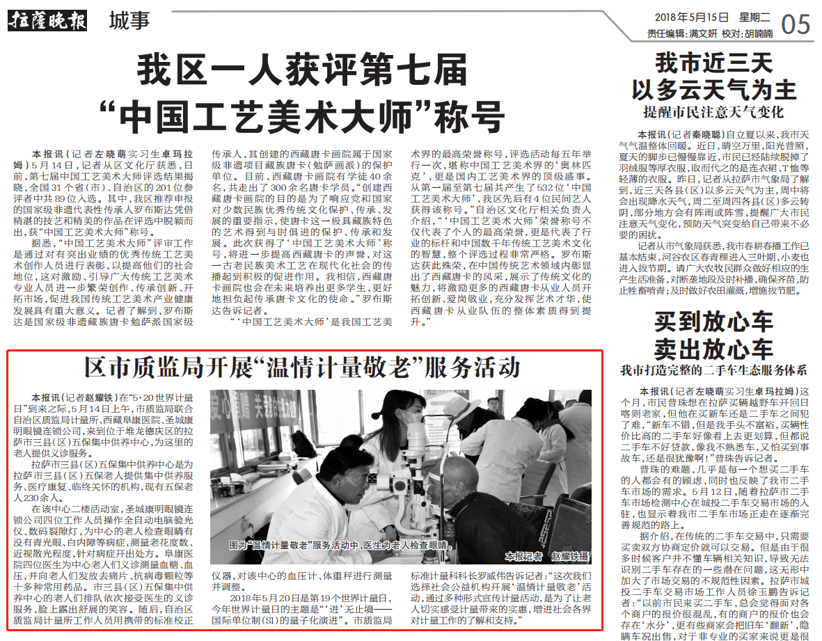 本報(bào)訊(記者趙耀鐵)在“5·20世界計(jì)量日”到來(lái)之際,5月14日上午,市質(zhì)監(jiān)局聯(lián)合自治區(qū)質(zhì)監(jiān)局計(jì)量所、西藏阜康醫(yī)院、圣城康明眼鏡連鎖公司,來(lái)到位于堆龍德慶區(qū)的拉薩市三縣(區(qū))五保集中供養(yǎng)中心,為這里的老人提供義診服務(wù)。