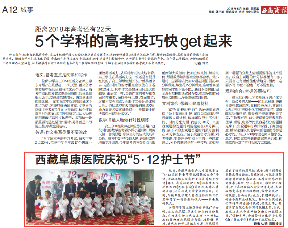 近日,西藏阜康婦產(chǎn)兒童醫(yī)院舉辦“5·12國(guó)際護(hù)士節(jié)暨脫帽換裝大會(huì)”活動(dòng),活動(dòng)現(xiàn)場(chǎng)不僅有護(hù)士代表荀琬平演講《再見,我美麗的護(hù)士帽》和阜康醫(yī)院導(dǎo)醫(yī)組的《禮儀表演》等醫(yī)院工作人員的表演,還有西藏大學(xué)帶來(lái)的節(jié)目。同時(shí),西藏阜康護(hù)理人員在這特殊的日子里舉行了一場(chǎng)特別的儀式——護(hù)士脫帽儀式。