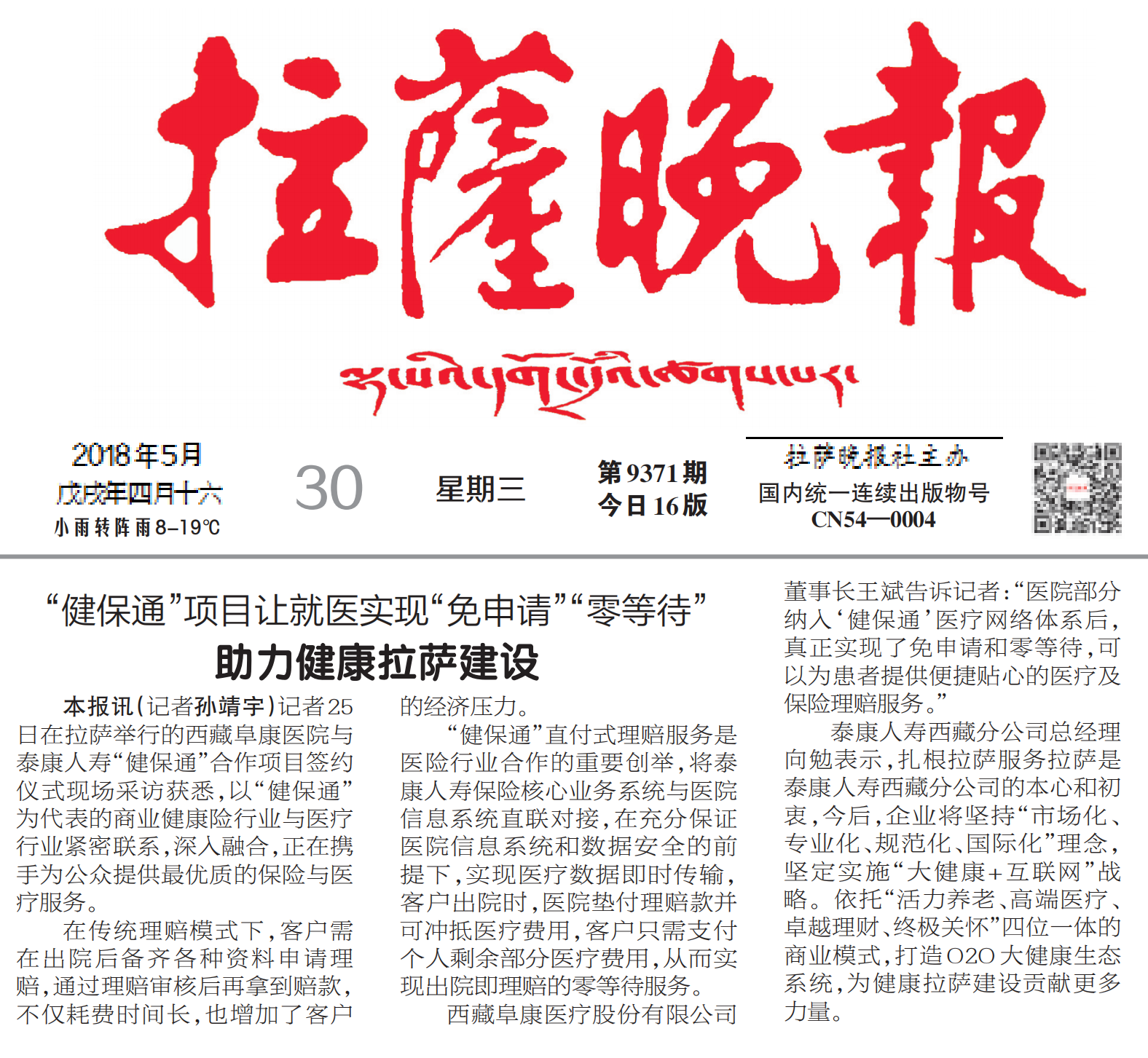 西藏阜康醫(yī)療股份有限公司董事長王斌告訴記者:“醫(yī)院部分納入‘健保通’醫(yī)療網絡體系后,真正實現(xiàn)了免申請和零等待,可以為患者提供便捷貼心的醫(yī)療及保險理賠服務。”