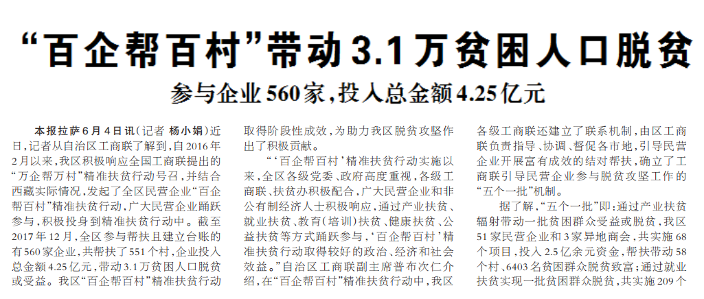 本報(bào)拉薩6月4日訊(記者 楊小娟)近日,記者從自治區(qū)工商聯(lián)了解到,自2016年2月以來(lái),我區(qū)積極響應(yīng)全國(guó)工商聯(lián)提出的“萬(wàn)企幫萬(wàn)村”精準(zhǔn)扶貧行動(dòng)號(hào)召,并結(jié)合西藏實(shí)際情況,發(fā)起了全區(qū)民營(yíng)企業(yè)“百企幫百村”精準(zhǔn)扶貧行動(dòng),廣大民營(yíng)企業(yè)踴躍參與,積極投身到精準(zhǔn)扶貧行動(dòng)中。截至2017年12月,全區(qū)參與幫扶且建立臺(tái)賬的有560家企業(yè),共幫扶了551個(gè)村,企業(yè)投入總金額4.25億元,帶動(dòng)3.1萬(wàn)貧困人口脫貧或受益。我區(qū)“百企幫百村”精準(zhǔn)扶貧行動(dòng)取得階段性成效,為助力我區(qū)脫貧攻堅(jiān)作出了積極貢獻(xiàn)。