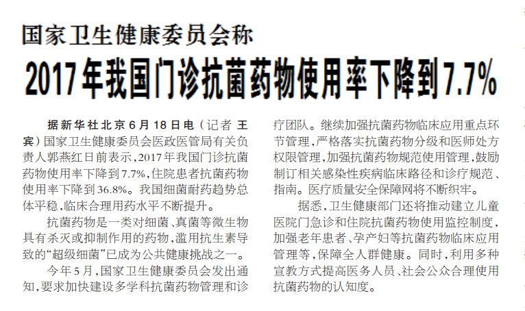 據(jù)新華社北京6月18日電 (記者 王賓) 國(guó)家衛(wèi)生健康委員會(huì)醫(yī)政醫(yī)管局有關(guān)負(fù)責(zé)人郭燕紅日前表示,2017年我國(guó)門(mén)診抗菌藥物使用率下降到7.7%,住院患者抗菌藥物使用率下降到36.8%。我國(guó)細(xì)菌耐藥趨勢(shì)總體平穩(wěn),臨床合理用藥水平不斷提升。