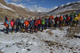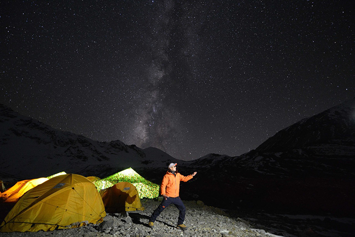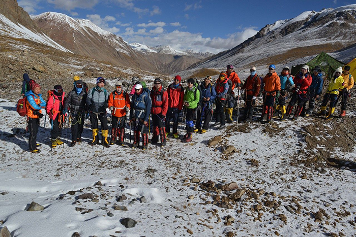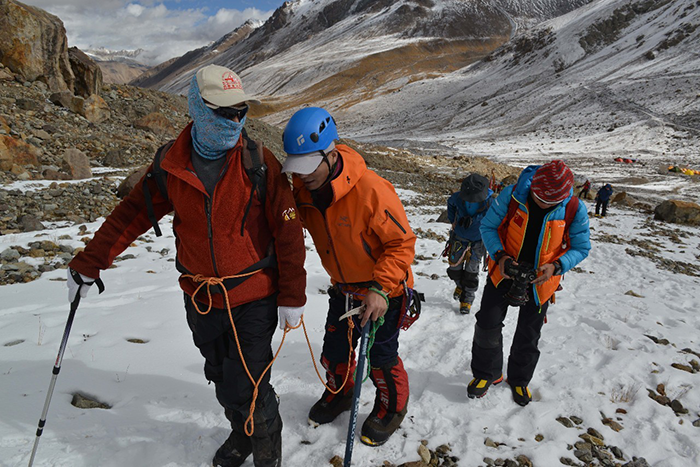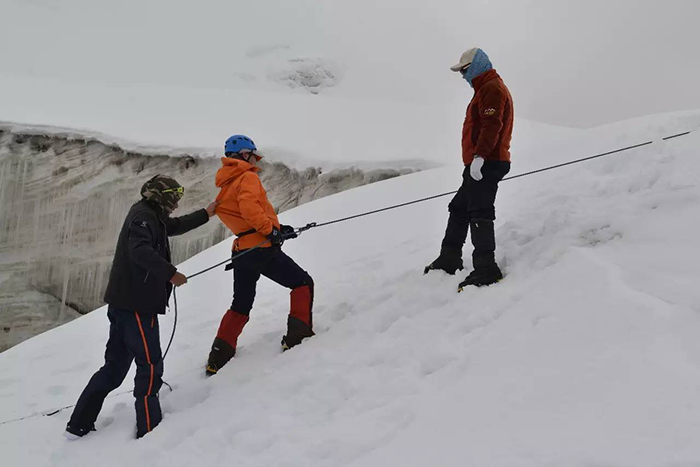 在海拔5500米處的雪線位置,教練們,選擇了一處較為平緩的雪坡,作為大本營,在這里對(duì)隊(duì)員們進(jìn)行登頂前的指導(dǎo)訓(xùn)練。指導(dǎo)隊(duì)員們使用上升器與下降器,體驗(yàn)穿著高山靴帶著冰爪走路的感覺,教練們?cè)谶@里認(rèn)真介紹技術(shù)要領(lǐng),并耐心解答隊(duì)員們提出的各種問題。休息之余大家都躲在帳篷里,有說有笑,完全消除了屋外雪山的寒冷。有從內(nèi)地來的隊(duì)友,因高原反應(yīng),頭疼難忍,張洪就幫他們一一按摩推拿,緩解疼痛,大家就像一家人,其樂融融。