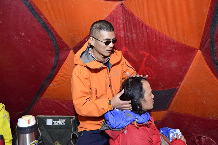 張洪說:“眼明的人,閉上眼往前走,就會(huì)很害怕,必須得睜開眼,他們有退路。但是我沒有,看不見就是看不見。但是我能聽,能感受,我的聽力比正常人要好很多。耳朵可以替代眼睛展現(xiàn)前方的路況。我的體力很好,為了參加登頂活動(dòng),我每天堅(jiān)持訓(xùn)練,太極,負(fù)重走,我得付出比正常人多得多的努力。平日里我加緊訓(xùn)練,買了鉛球,每天負(fù)重40公斤來回爬樓梯近50層,再徒步送孩子上學(xué),最后返回醫(yī)院上班,行走里程達(dá)3公里。太累的時(shí)候我會(huì)練習(xí)太極,太極可以緩解疲勞,讓身體和精神都處于放松的狀態(tài),在放松的同時(shí),也增強(qiáng)了身體的靈敏度。所以除了眼睛不好以外,其他方面我都沒有問題。”