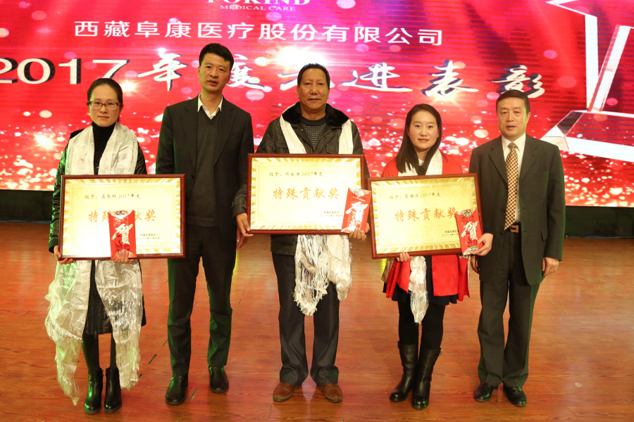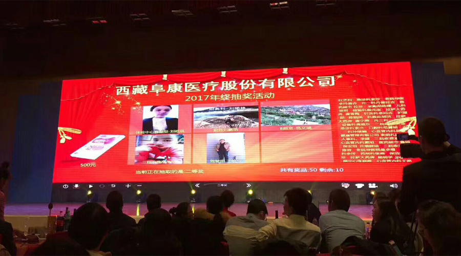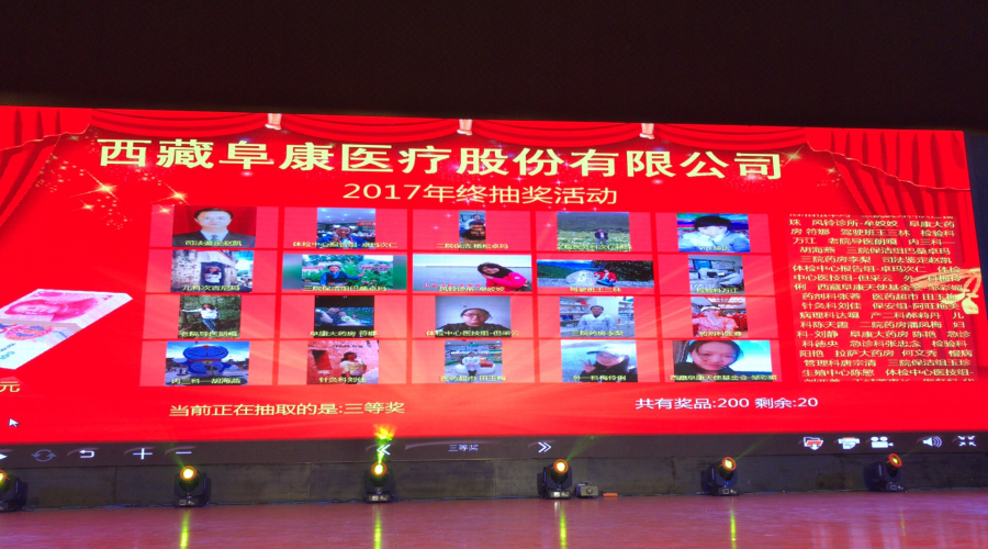 2018年1月10日,西藏阜康醫(yī)療股份有限公司新年團(tuán)拜會(huì)在拉薩洲際酒店舉行,下午四點(diǎn)來(lái)自西藏阜康醫(yī)院、婦產(chǎn)兒童分院、心腦血管分院、健康體檢中心,阜康大藥房、超市的員工陸續(xù)來(lái)到會(huì)場(chǎng)。下午五點(diǎn),主持人劉連福院長(zhǎng)宣布會(huì)議正式開(kāi)始,場(chǎng)內(nèi)音樂(lè)響起,董事長(zhǎng)王斌帶領(lǐng)醫(yī)院領(lǐng)導(dǎo)和特邀嘉賓入場(chǎng),會(huì)場(chǎng)立刻響起雷鳴般的掌聲和歡呼聲。