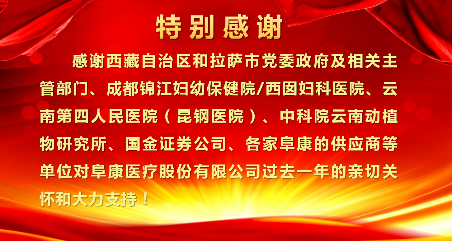 我之存在,因?yàn)橛心?;百年阜康,感恩有您。感恩是一種態(tài)度、一種美德、一種情懷!不忘初心、砥礪前行,感謝你們的一路陪伴,阜康的輝煌離不開(kāi)每一位阜康人的奉獻(xiàn),雄關(guān)漫道真如鐵,而今邁步重頭越!2018年將是阜康騰飛的一年,在各級(jí)領(lǐng)導(dǎo)關(guān)心下,各位同仁支持下,阜康一年更比一年好!以十九大精神為指導(dǎo),努力打造“團(tuán)結(jié)、創(chuàng)新、規(guī)范、節(jié)約、用心”五位一體的現(xiàn)代化醫(yī)院!為西藏人民群眾解決看病遠(yuǎn)、看病難、看病貴的問(wèn)題,全心全意為西藏人民健康服務(wù)!